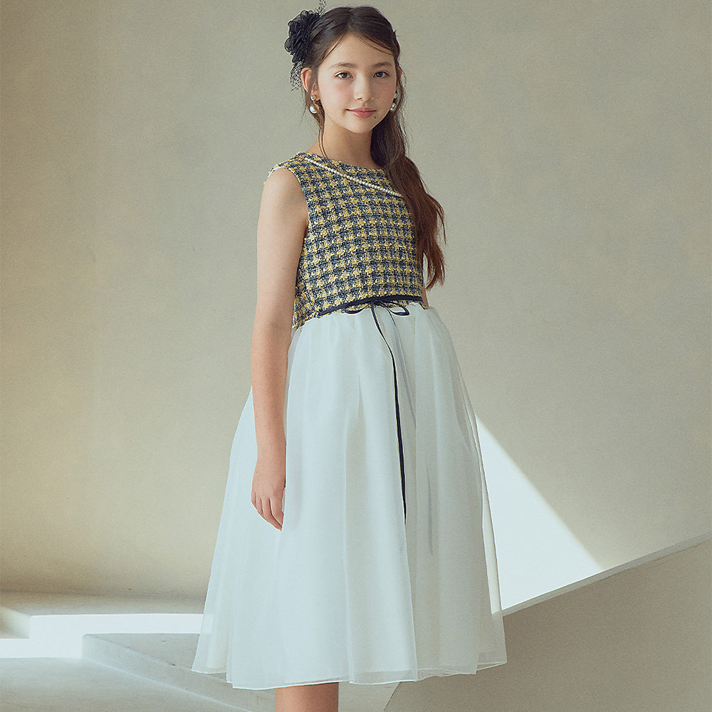トップス部分には、奥行きのある表情をもつツイード生地を採用。ネイビーとマスタードカラーの織り柄が上品な存在感を放ち、クラシカルな雰囲気の中にも華やかさを感じさせます。ウエストには細リボンのアクセントを添え、シルエットにさりげないメリハリをプラスしました。