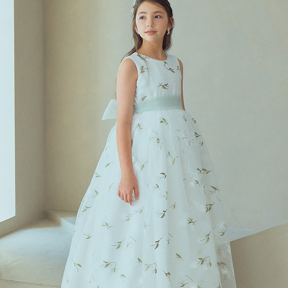 トップスには繊細なフローラル刺繍を贅沢にあしらい、上品な装いを添えました。ウエストには大きなチュールリボンを飾り、可憐なシルエットを引き立てます。