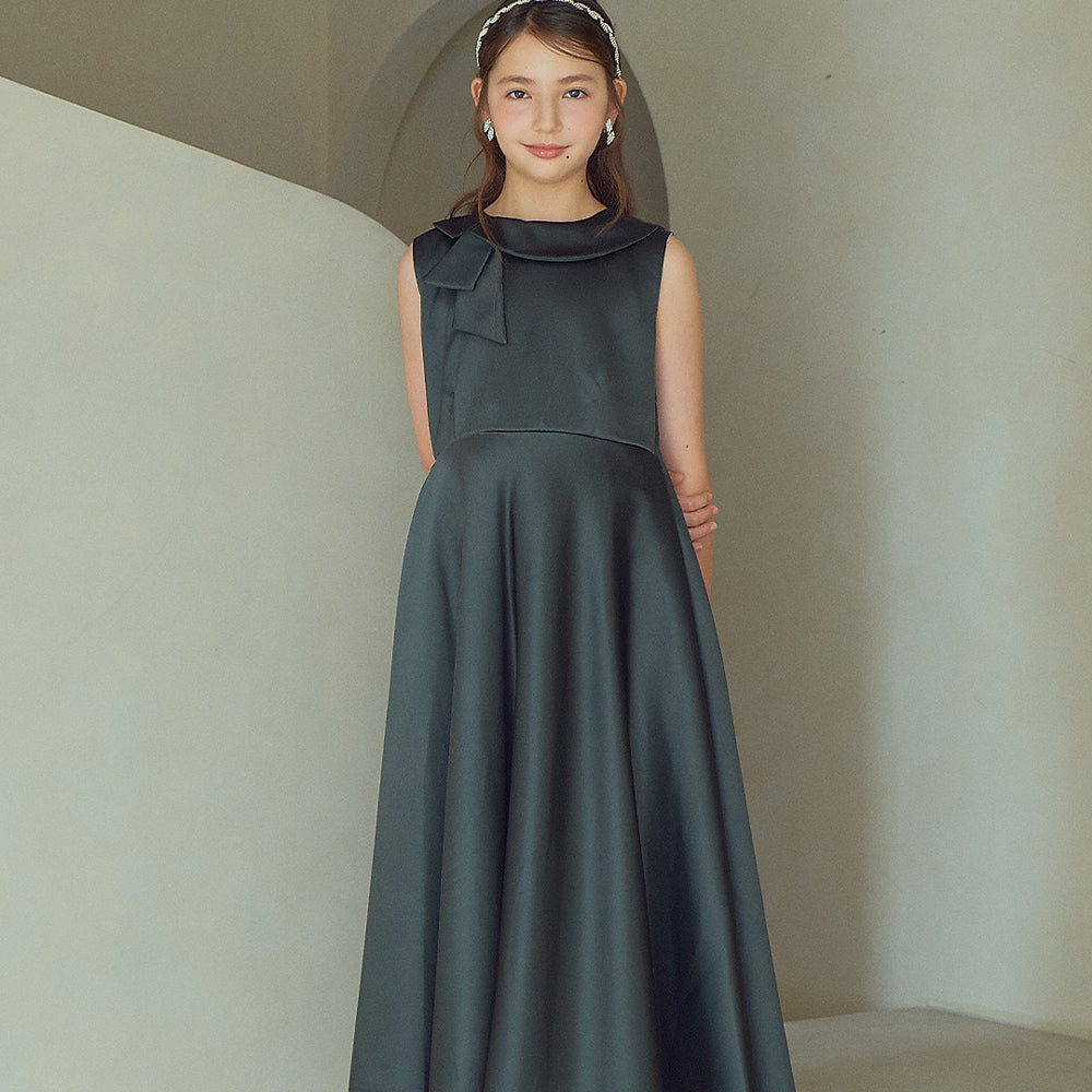 肩にあしらわれた大きなリボンと流れるようなパールチェーンが顔まわりを上品に彩り、記念日や発表会、セレモニーなど特別な日の装いに華を添えます。