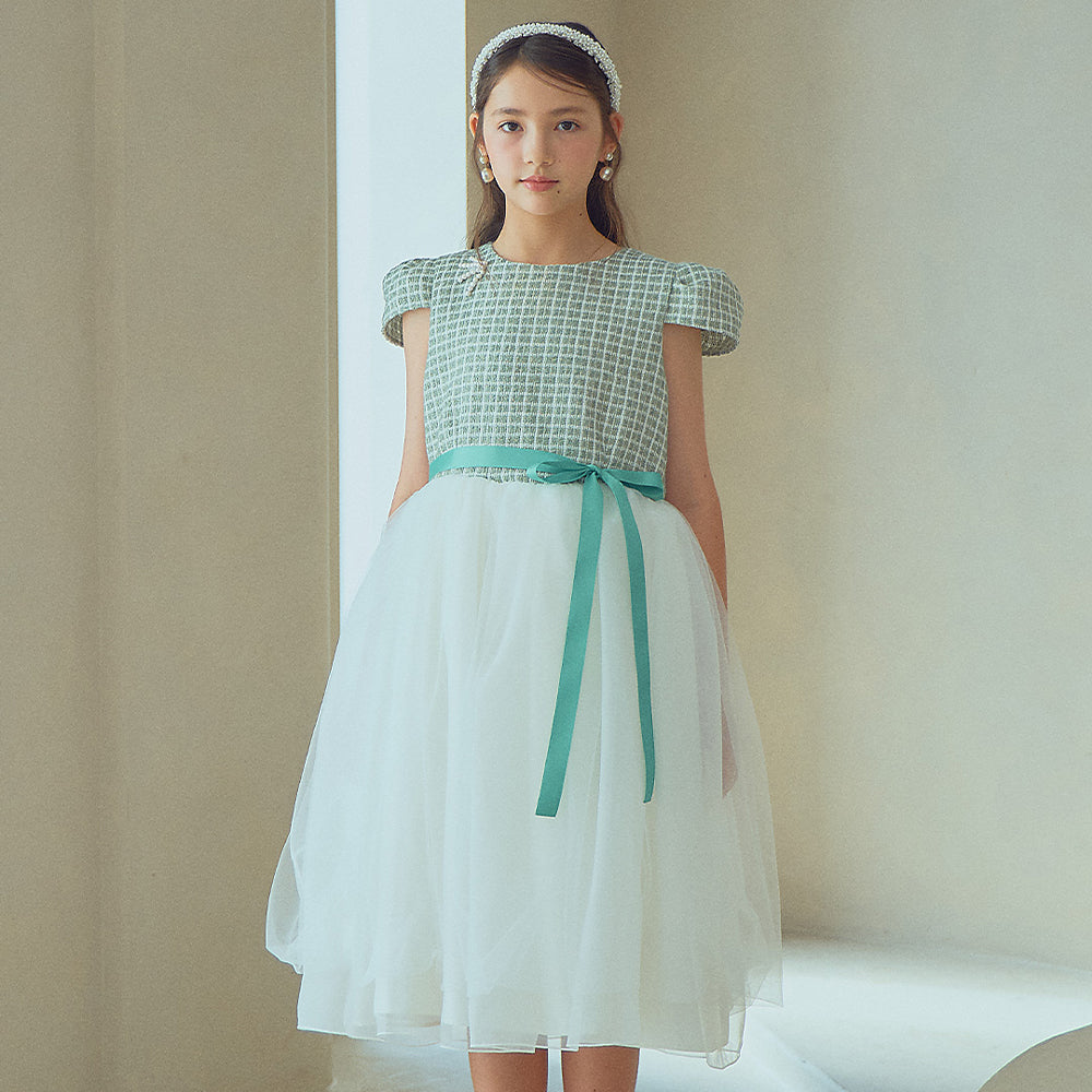 爽やかなグリーンのツイード生地をトップスに使用し、やわらかなホワイトチュールのスカートを組み合わせたクラシカルなドレス。