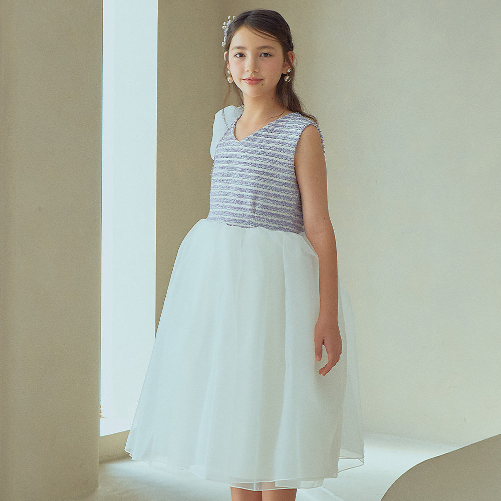 ラベンダー×ブルー×ホワイトに金糸が入ったボーダー柄が可愛いツイードドレスは、セミフォーマルなテイストながらも、スカートのふんわり感や装飾など、フォーマルドレスのディテールをたっぷり取り込んだオシャレな仕上がりとなっています。