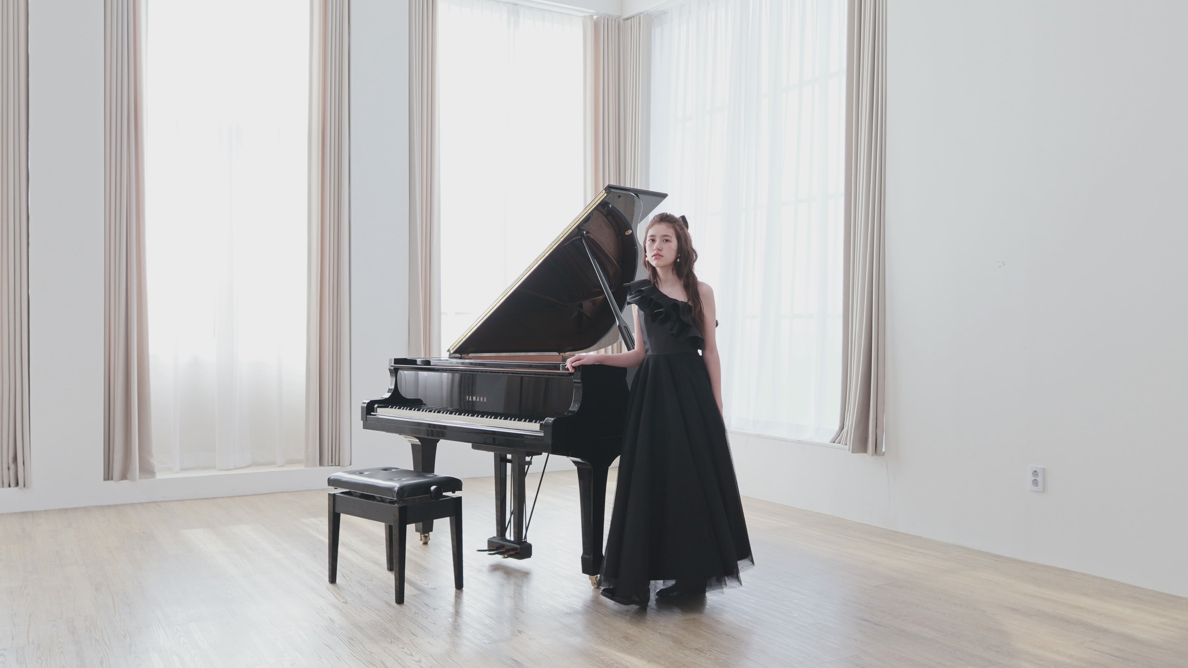 ミカドサテン素材で仕立てられたワンショルダーデザインのジュニア向けブラックドレスです。