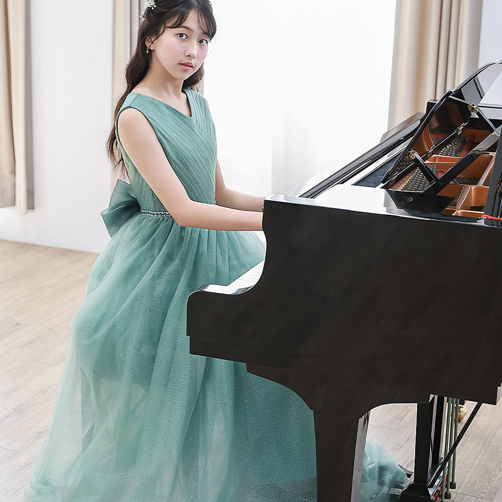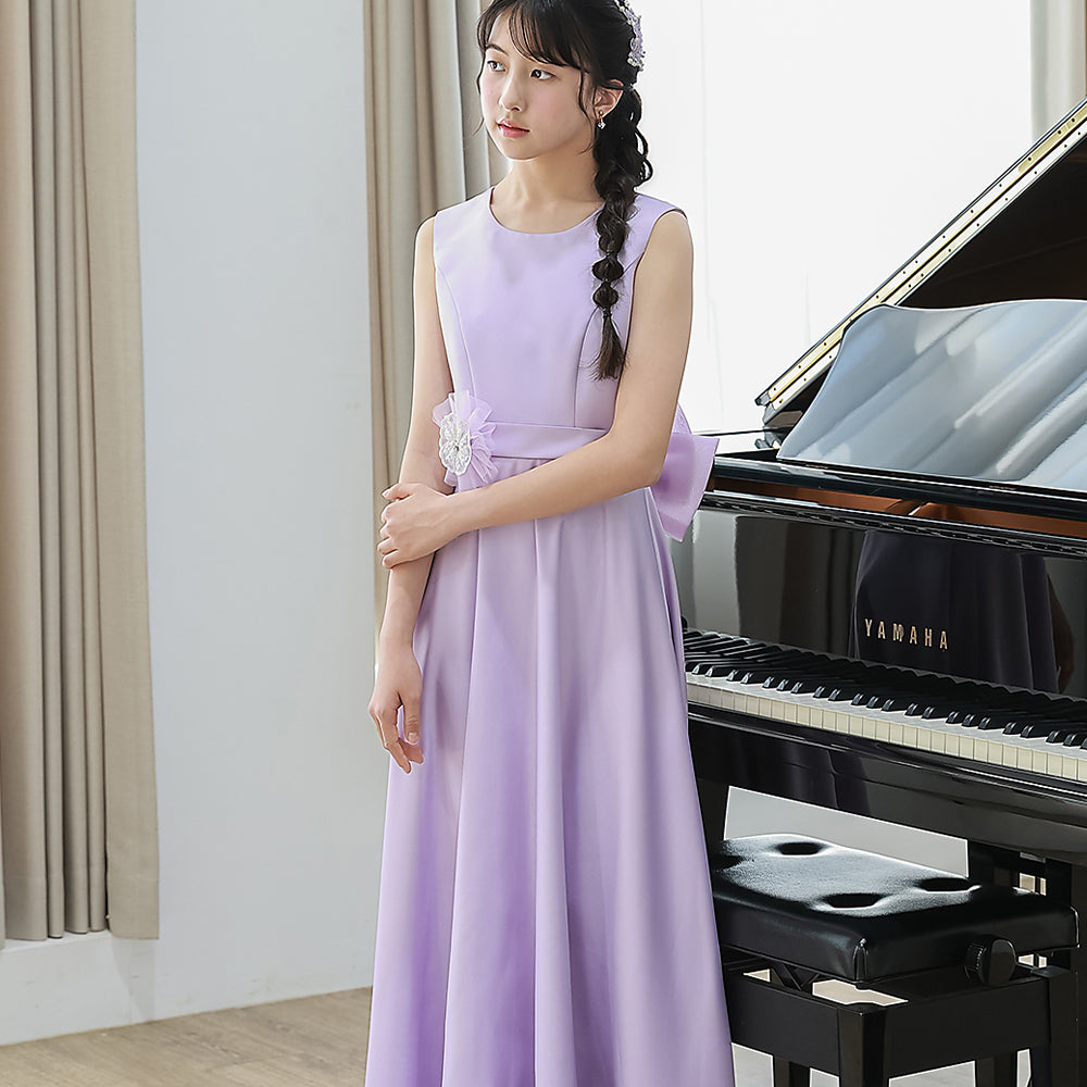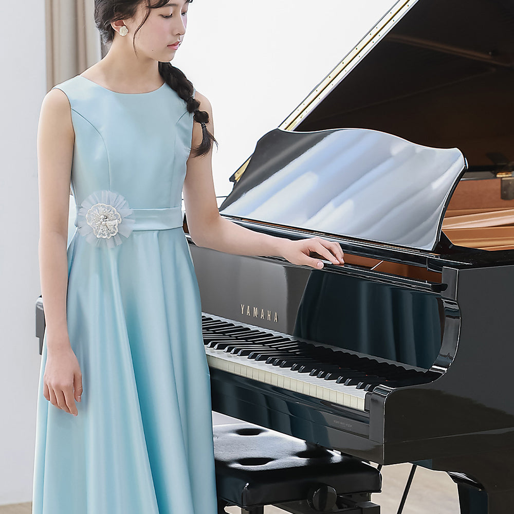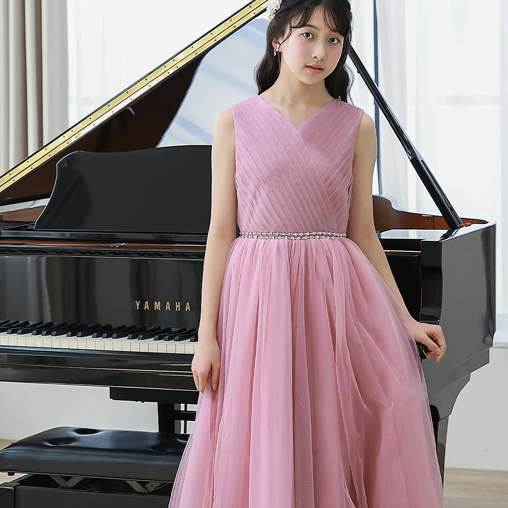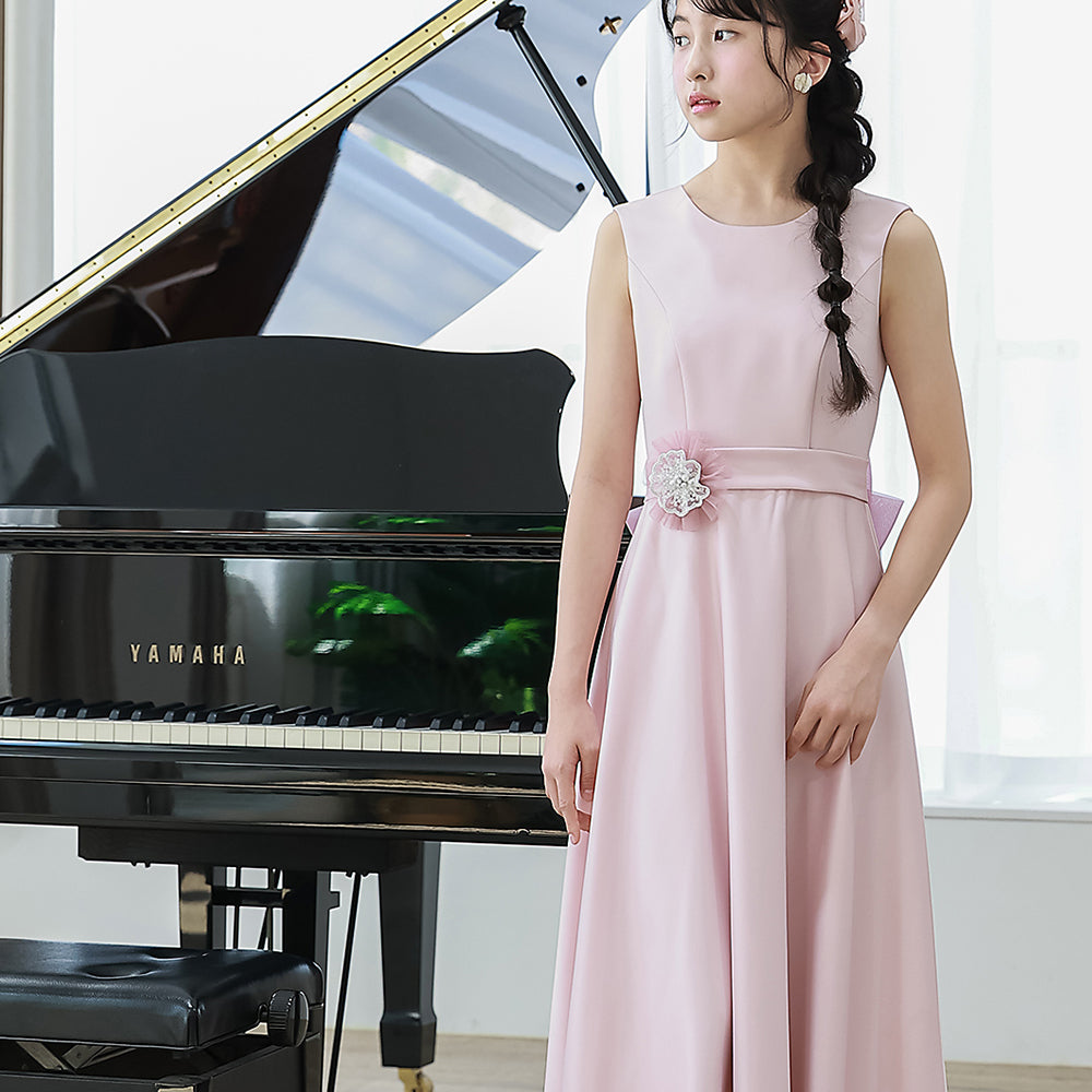 淡いミルキーピンクの色合いが清楚で優雅な雰囲気を漂わせ、発表会やコンクールなど格式あるシーンにふさわしい一着です。