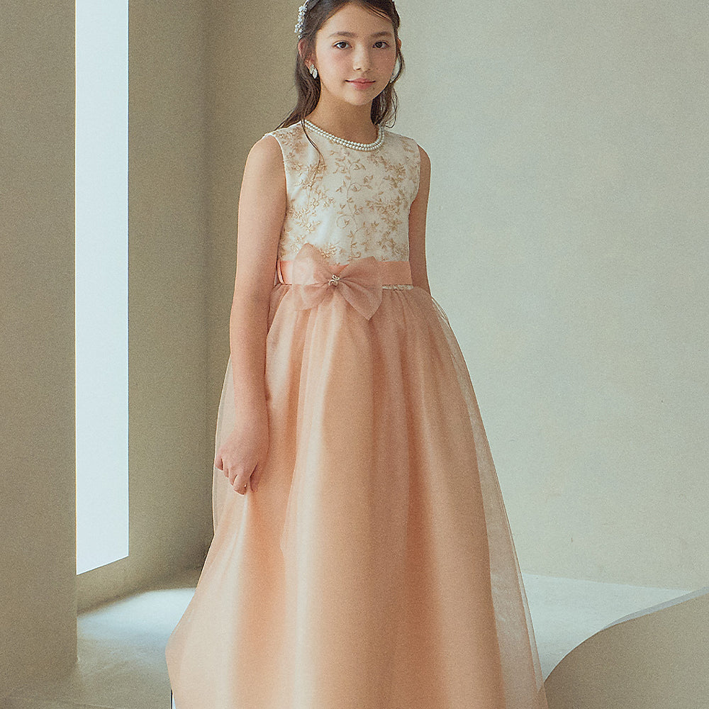 淡くやさしいピーチカラーが印象的な、華やかで愛らしい印象のロングドレス。