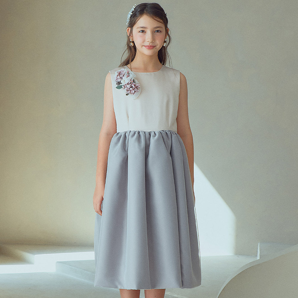 シンプルなシルエットに、胸元を飾る立体的なフラワーモチーフが印象的なフォーマルドレス。