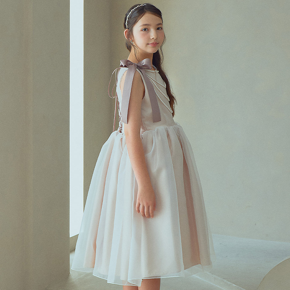肩にあしらわれた大きなリボンと流れるようなパールチェーンが顔まわりを上品に彩り、記念日や発表会、セレモニーなど特別な日の装いに華を添えます。
