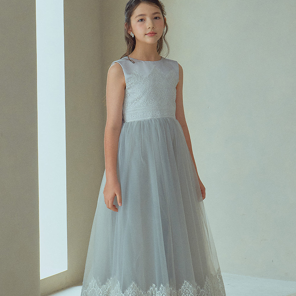 裾に向かってふんわりと広がるチュールスカートには、裾を囲むように施されたレース刺繍がアクセントとなり、足元まで気品あるシルエットを描きます。