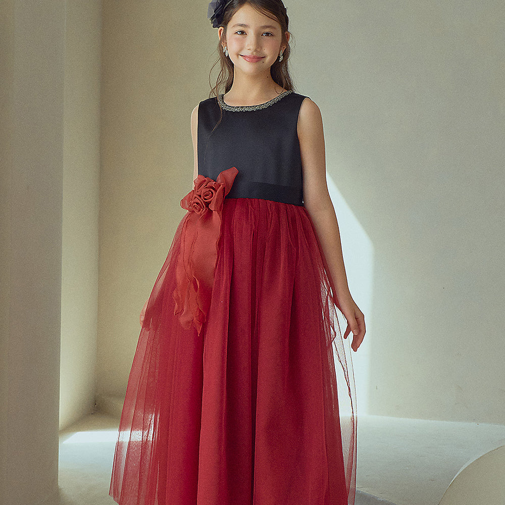 上品なワインレッドとブラックの配色が目を惹くシックながらも華やかな印象のロングドレス。