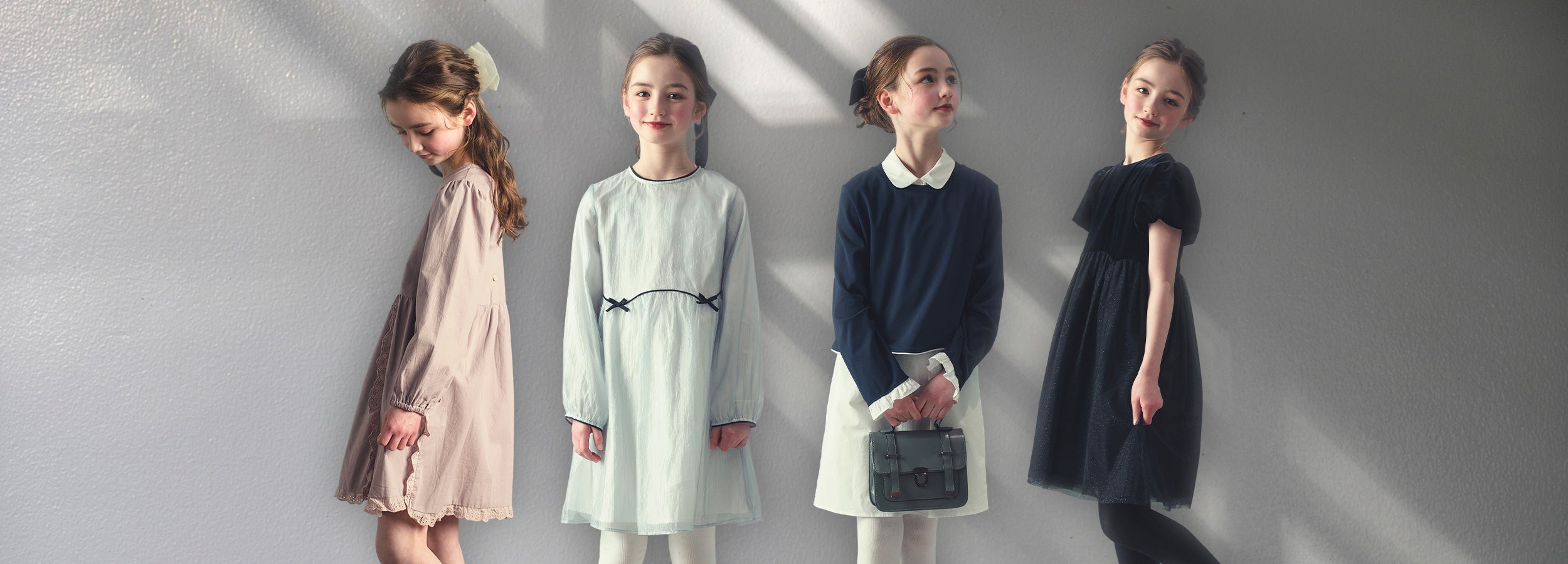 ネイビーのトップスは柔らかなカットソー素材で快適な着心地。裾の波型カットと袖口のフリルが、上品なアクセントをプラスします。ホワイトのワンピースは清楚なラウンドカラー付きで、クラシカルな雰囲気を演出。